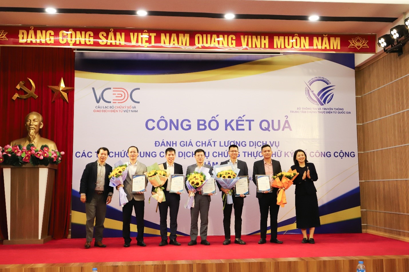 Giám đốc NEAC Tô Thị Thu Hương và Chủ nhiệm Câu lạc bộ Chữ ký số và giao dịch điện tử Việt Nam Phùng Huy Tâm đã trao chứng nhận danh hiệu ‘Top 5 CA có chất lượng dịch vụ tốt nhất năm 2024’ cho các đơn vị CA.