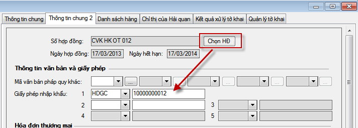 Khi doanh nghiệp chọn "Số hợp đồng" trên "Tab thông tin chung 2" chương trình sẽ tự động tạo dữ liệu vào mục mã loại giấy phép sẽ là "HDGC" và chỉ tiêu số giấy phép sẽ là "Số tiếp nhận của hợp đồng gia công"