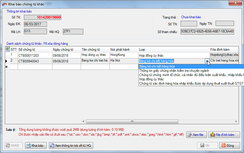 Đây là chức năng cho phép doanh nghiệp khai báo bổ sung chứng từ cho hồ sơ tờ khai xuất nhập khẩu, ở bản cập nhật mới này có bổ sung loại chứng từ cụ thể như sau: