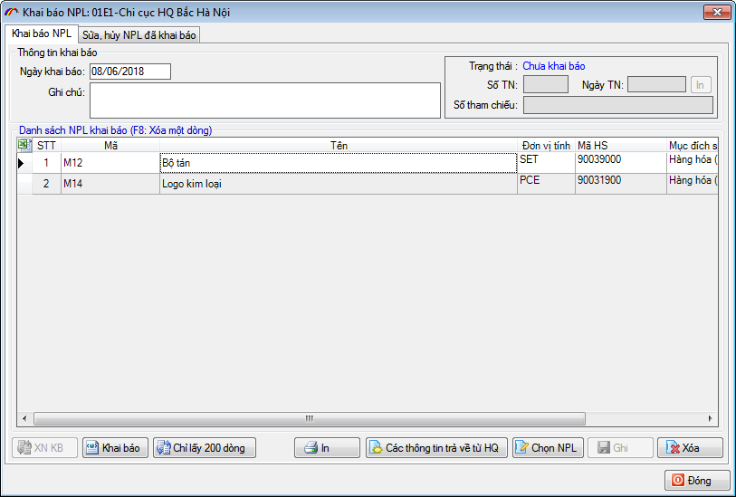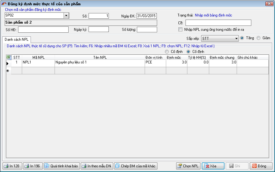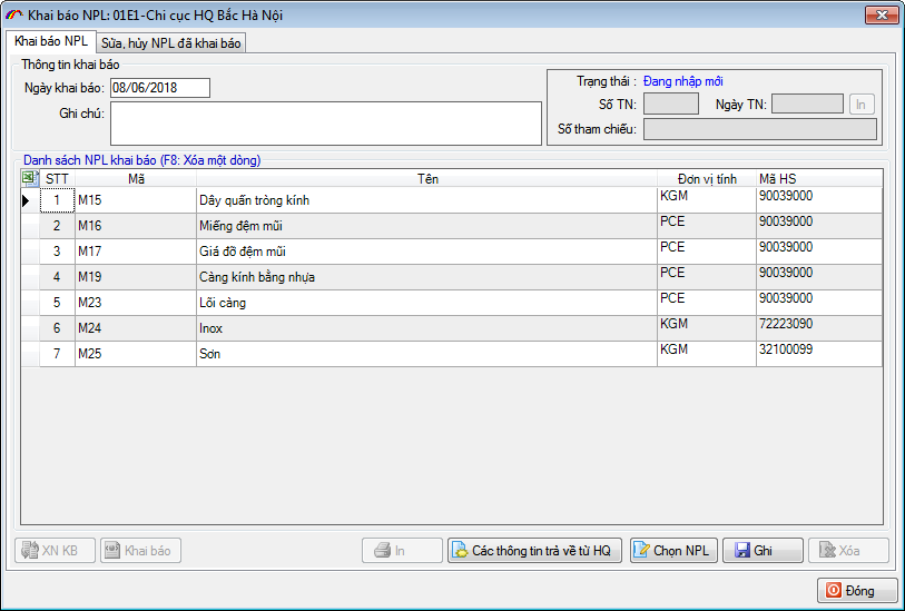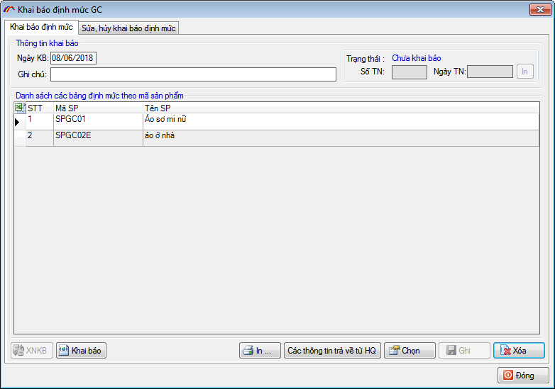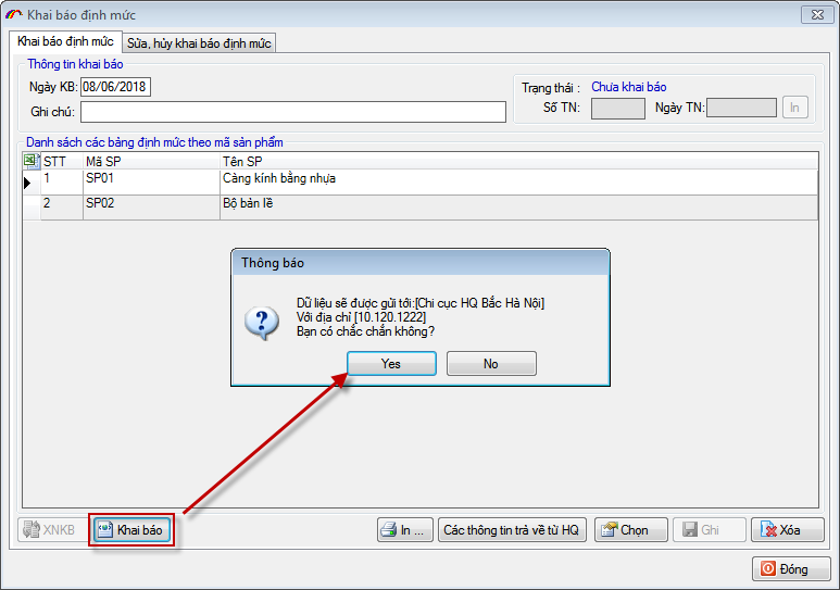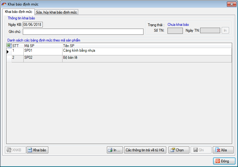 Tại đây bạn thực hiện "Ghi" dữ liệu và "khai báo" thông tin định mức sản phẩm tới hệ thống hải quan