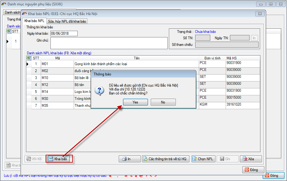 Thực hiện nhấn "Khai báo" để khai báo danh mục nguyên phụ liệu tới hệ thống hải quan.