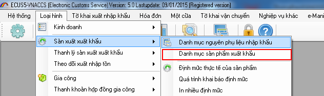Đối với danh mục Sản phẩm xuất khẩu, bạn vào menu “Loại hình / Sản xuất xuất khẩu” và chọn “Danh mục sản phẩm khẩu”: