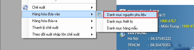 Để nhập danh mục nguyên phụ liệu chế xuất bạn vào menu “Loại hình / Danh mục hàng hóa đưa vào” vào chọn mục “Danh mục nguyên phụ liệu”: